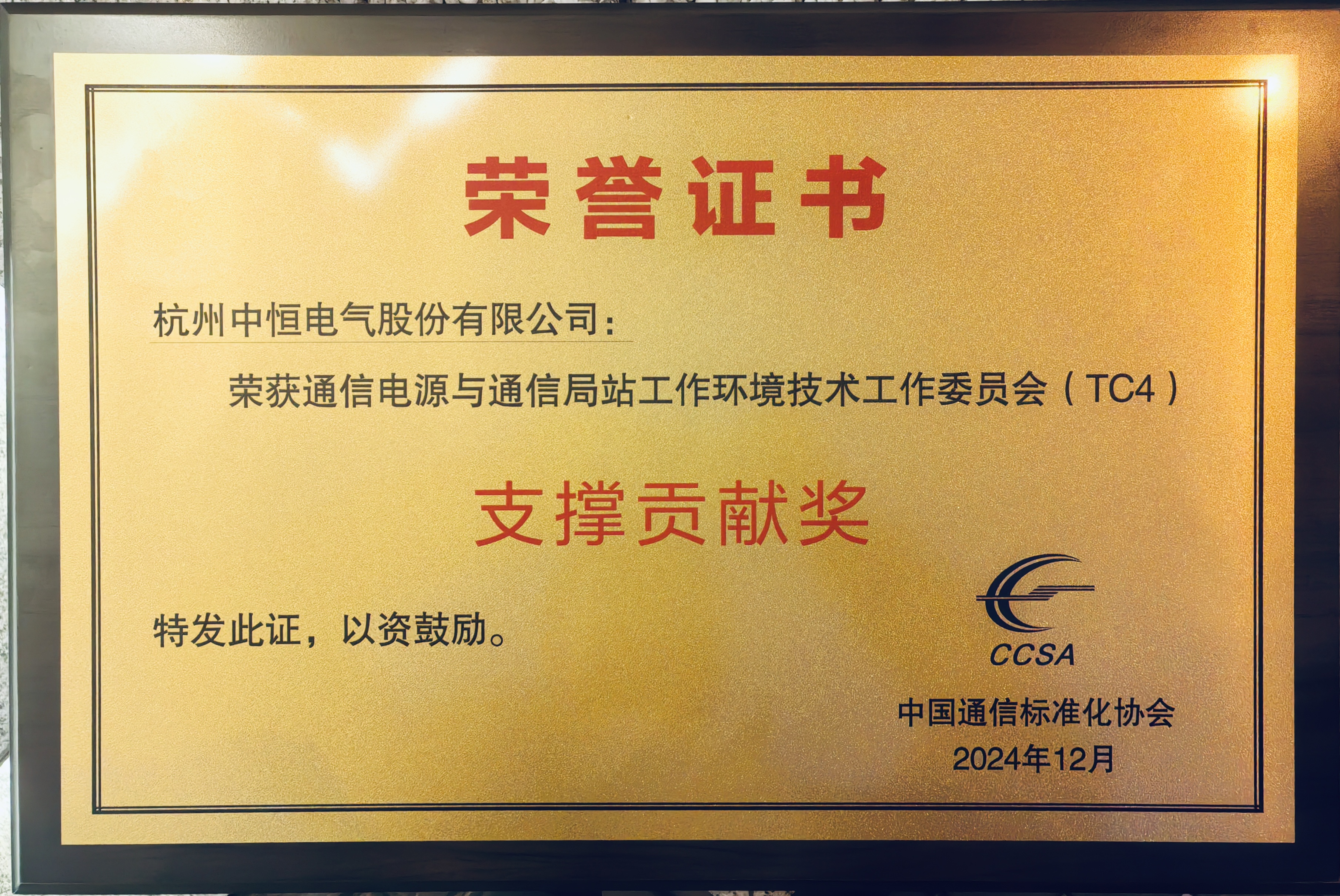 喜報 | 中恒電氣榮獲CCSA TC4支撐貢獻獎